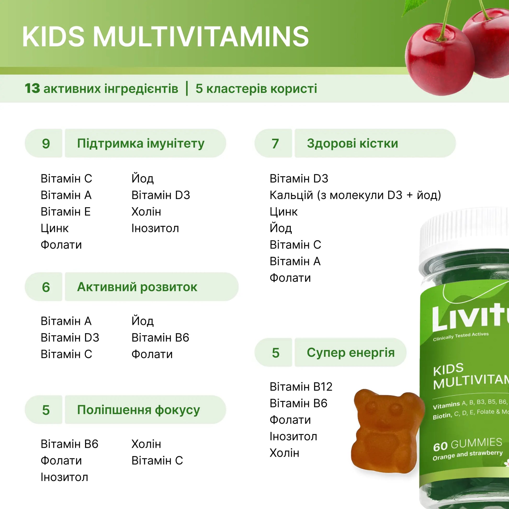 Підтримка імунітетуАктивний розвитокПоліпшення фокусуЗдорові кісткиПідвищена енергія